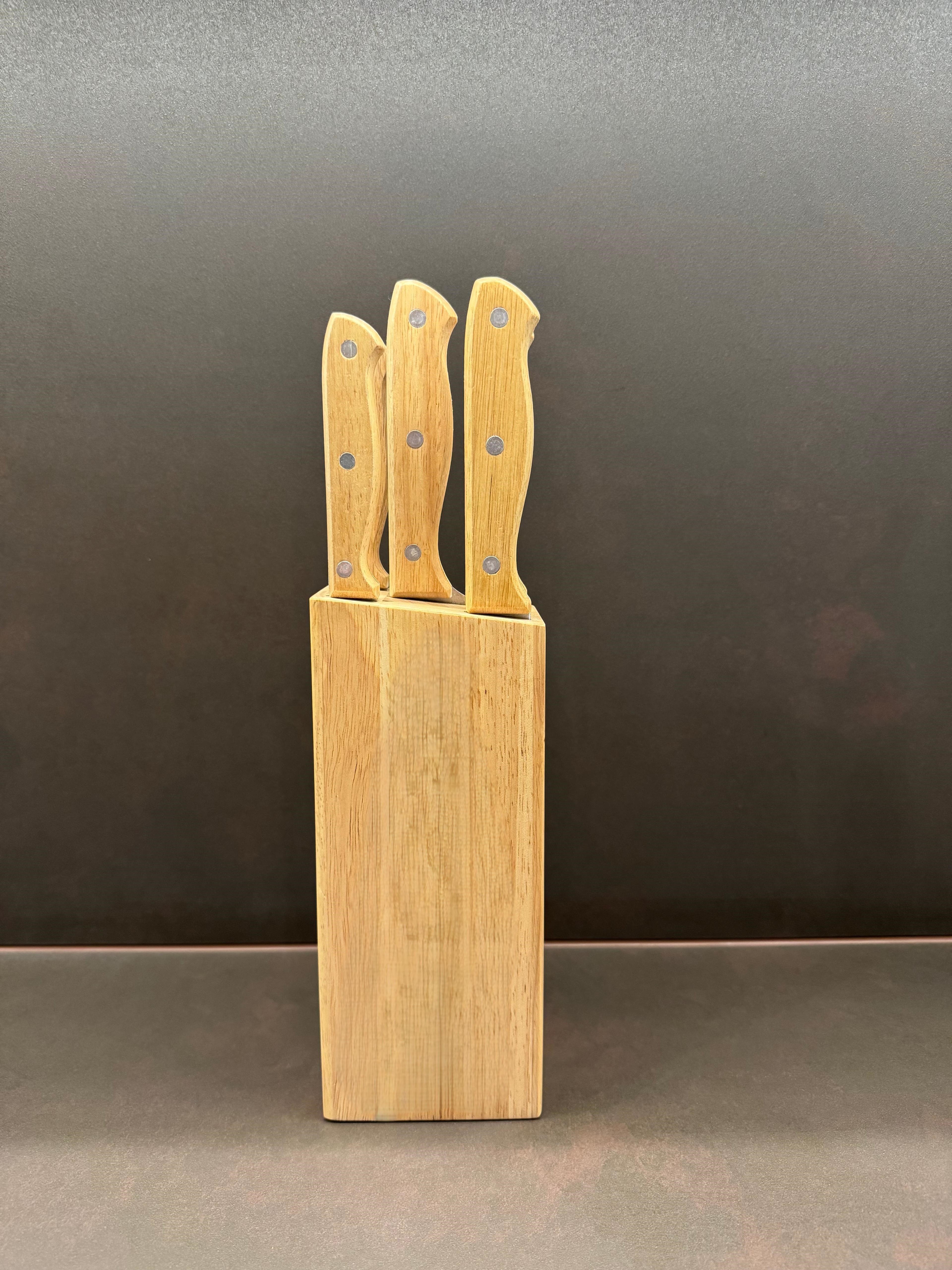 Messerblock aus Holz mit 5 unterschiedlichen Messern: Kochmesser, Brotmesser,Tranchiermesser, Universalmesser und Schälmesser. Alle Messer sind im Messerblock perfekt aufgehoben. Das Holz verleiht Ihrer Küche einen schönennatürlichen Touch. Ein komplettes Set zum Vorbereiten von Gemüse, Fleisch,Fisch, Brot und leckeren selbstgemachten Gerichten. Die Messerklingen sind aus Edelstahl gefertigt und haben einen Griff aus Holz. Da Holz ein natürlichesMaterial ist, können Farbton und Masse pro Artikel variieren. Dies kann zu Abweichungen im Ergebnis der Veredlung führen.